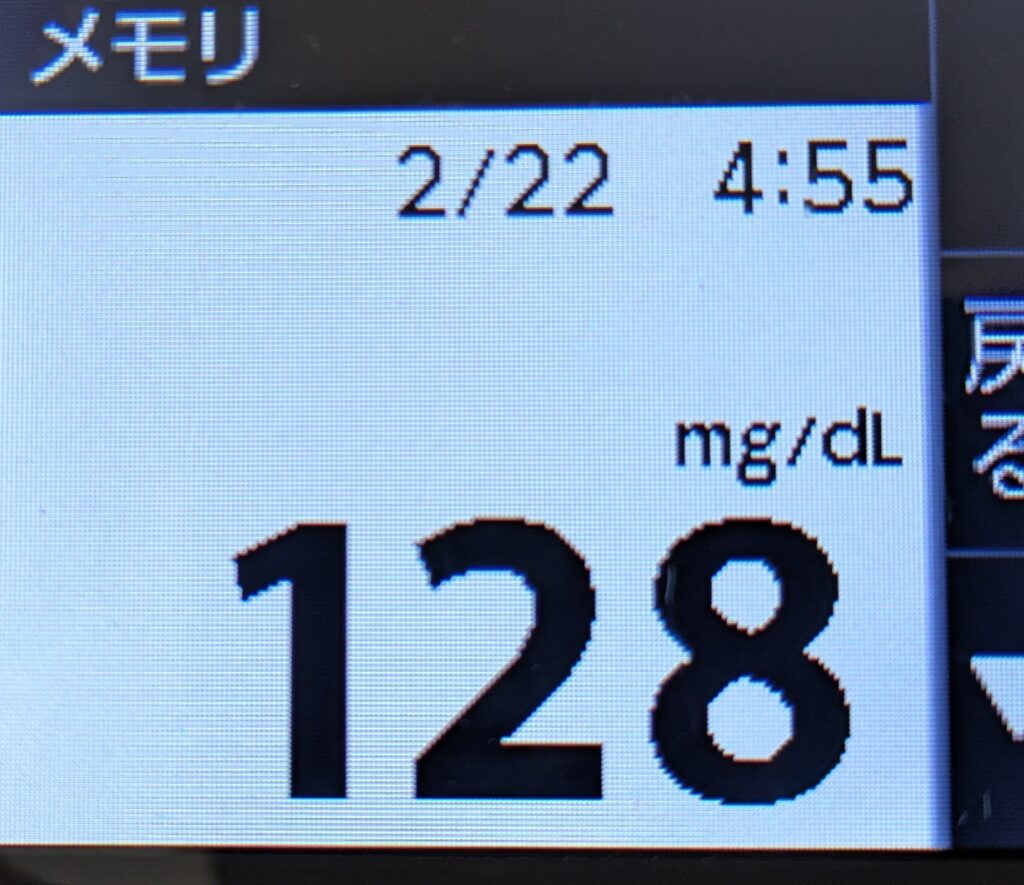2月22日日曜日の空腹時血糖値は128mg/dlでした。